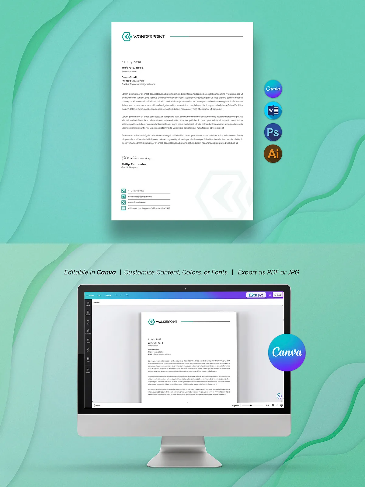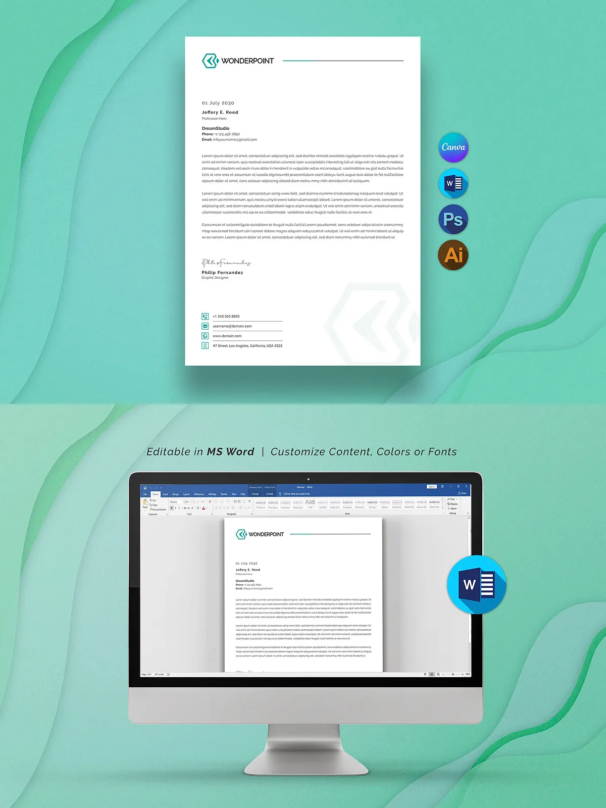 Transform the letterhead in minutes. Change your brand color palette, insert your company logo, switch fonts to match your brand voice — all without breaking a sweat.