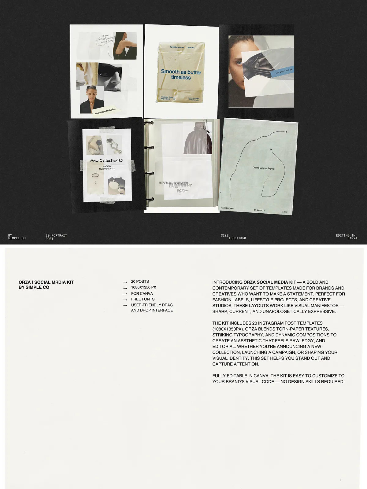 ORZA blends raw, tactile textures with clean, powerful composition to create an aesthetic that feels both organic and intentional. Torn-paper overlays, asymmetric layouts, and dynamic typography converge to form a distinctive editorial flair. Every template is curated to reflect the energy of today’s most admired brands — confident, expressive, and deeply modern.