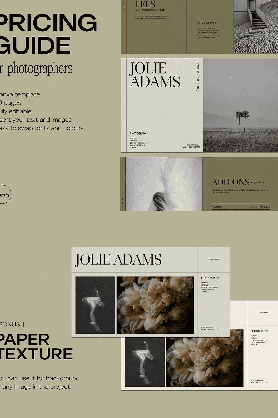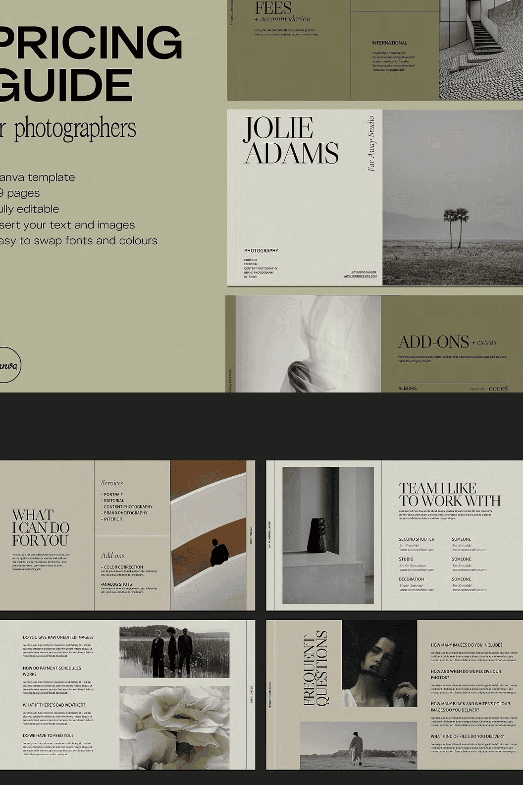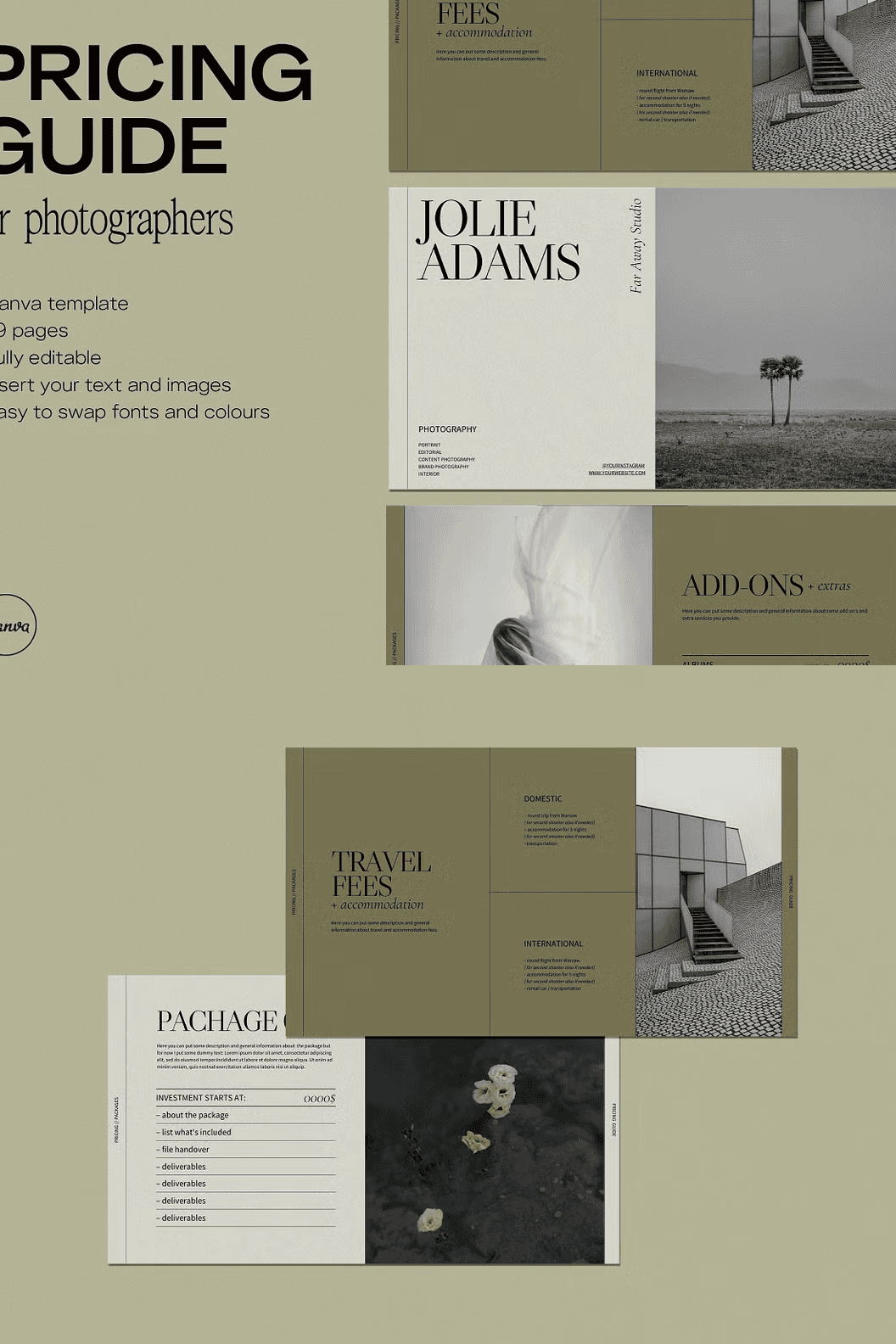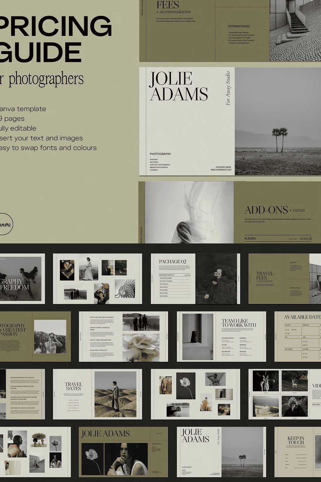 Introducing the JOLIE Pricing Guide for photographers. A strapping 29 pages-worth of professionally designed, fully customisable templates ready to use with Canva for outstanding presentation of your pricing. With JOLIE presenting your price list in a sleek, professional and orderly manner is as simple as it gets. Our templates can be adjusted and customised to your liking, making reaching out to your clients a breeze. Whether you specialise in portraits, interiors, weddings or even do editorials, commercial, product or lifestyle photography – the JOLIE templates have been carefully designed to be as flexible as possible. The JOLIE Pricing Guide is ready to use with Canva, an accessible, straightforward graphic design platform with which you can easily reach a coherent style of visual communication for your brand. The tool allows for easy manoeuvring of each element of the template, letting you swap colours, change typefaces and move each element around freely so that everything is perfectly to your liking.