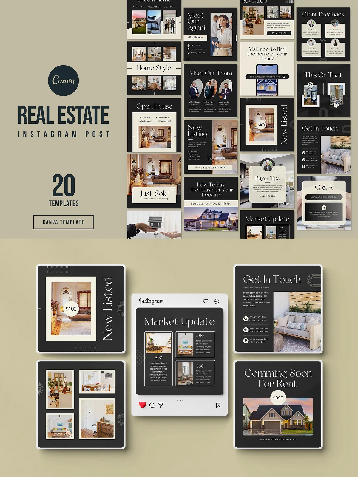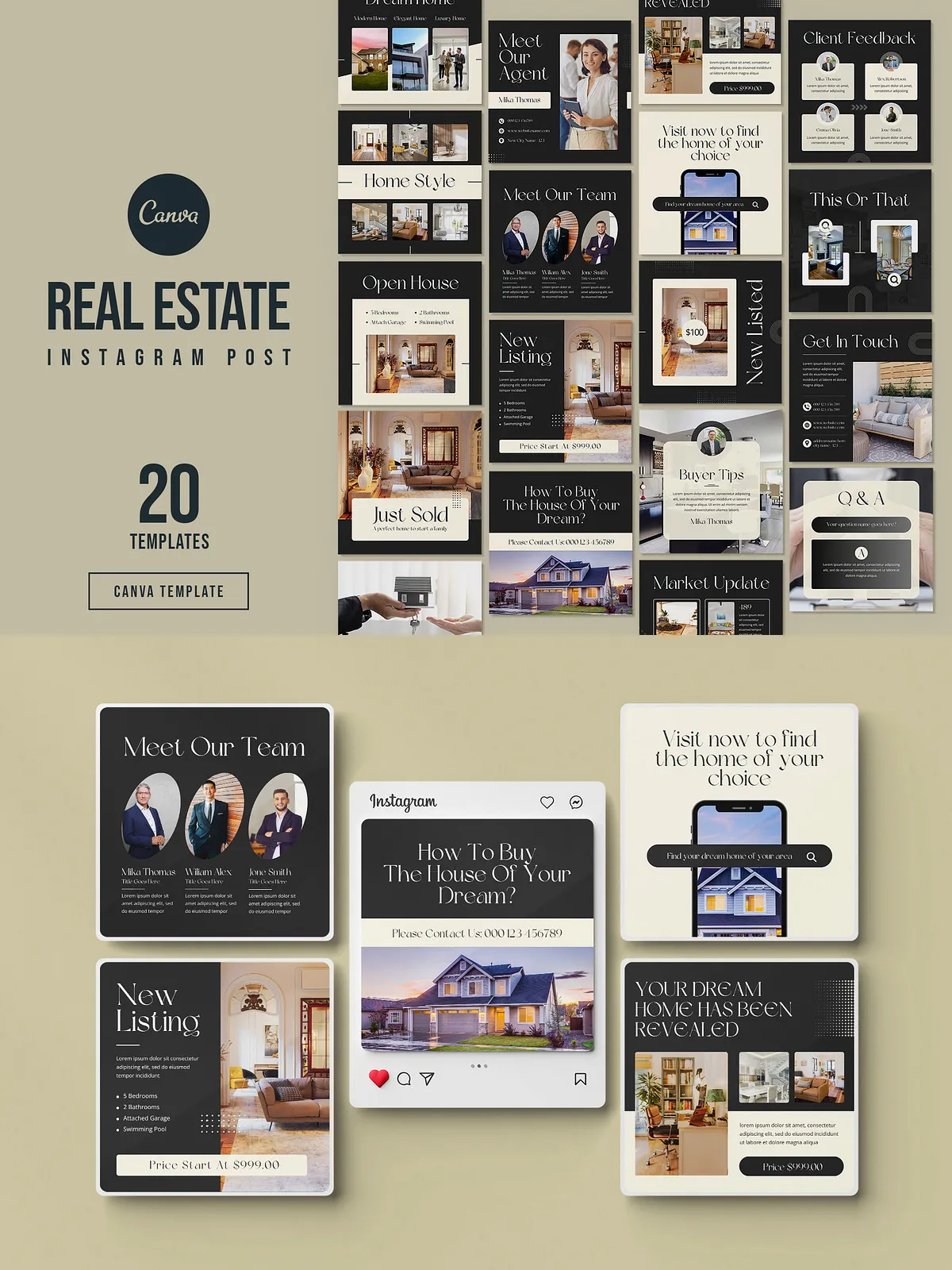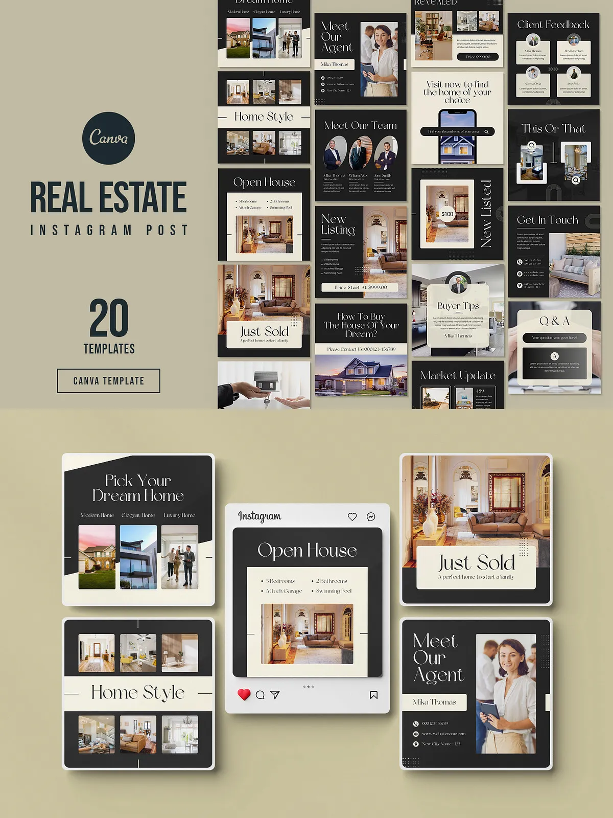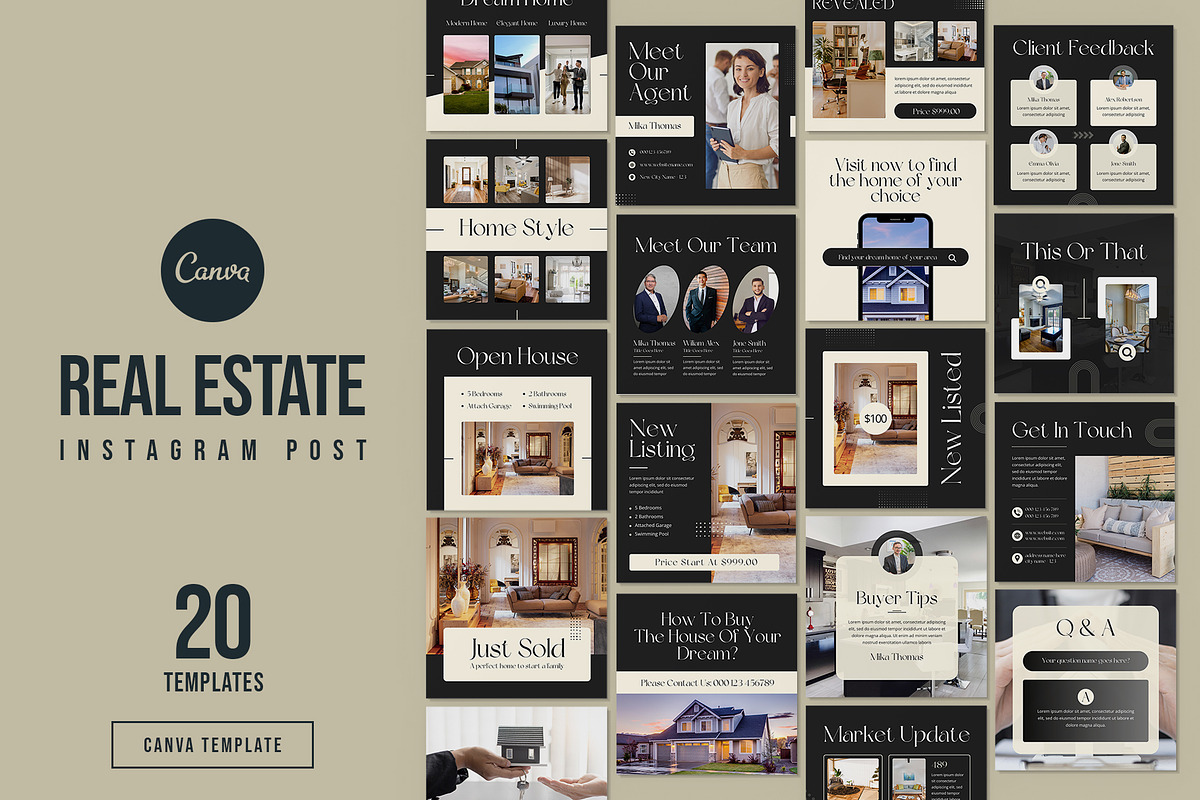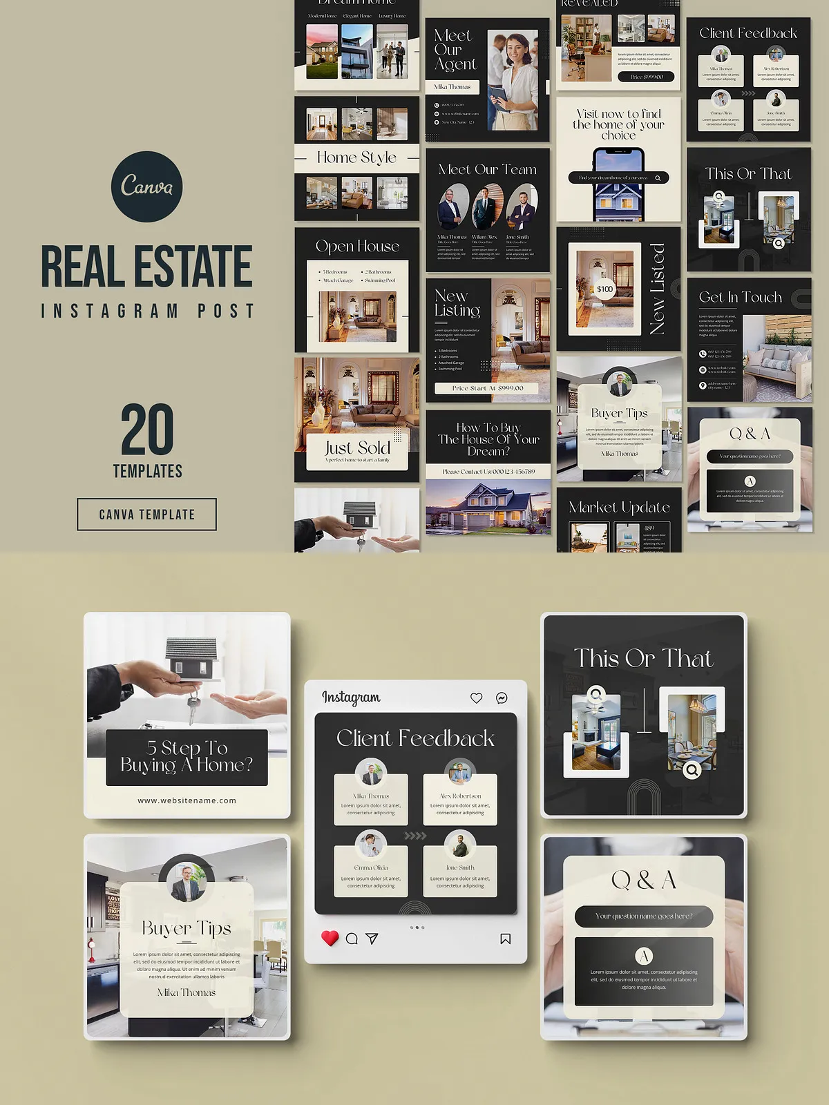 - 20 Unique Instagram Templates – A diverse set of designs for property listings, open houses, neighborhood guides, client testimonials, and more. Never run out of creative ideas for your feed.