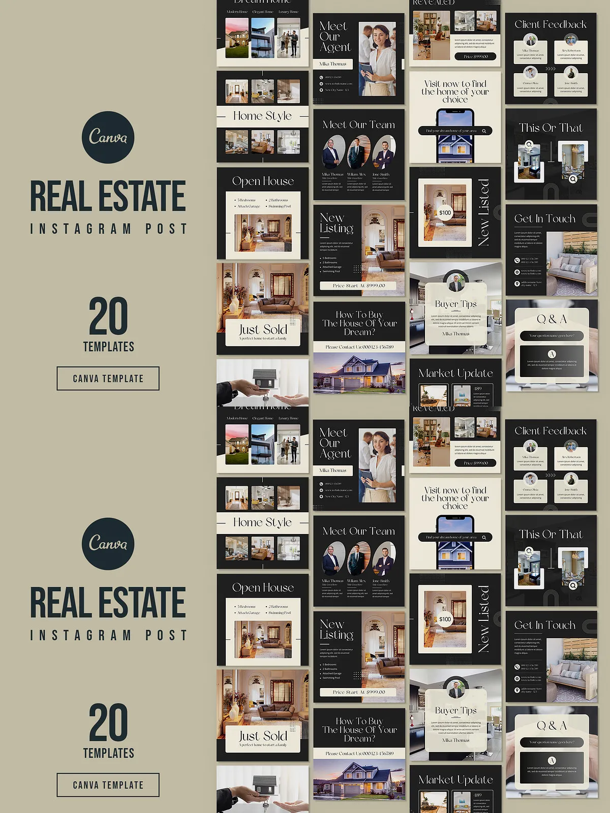 - 20 Canva Templates – Variety of post types for maximum versatility, including property showcases, before/after shots, neighborhood highlights, and more.