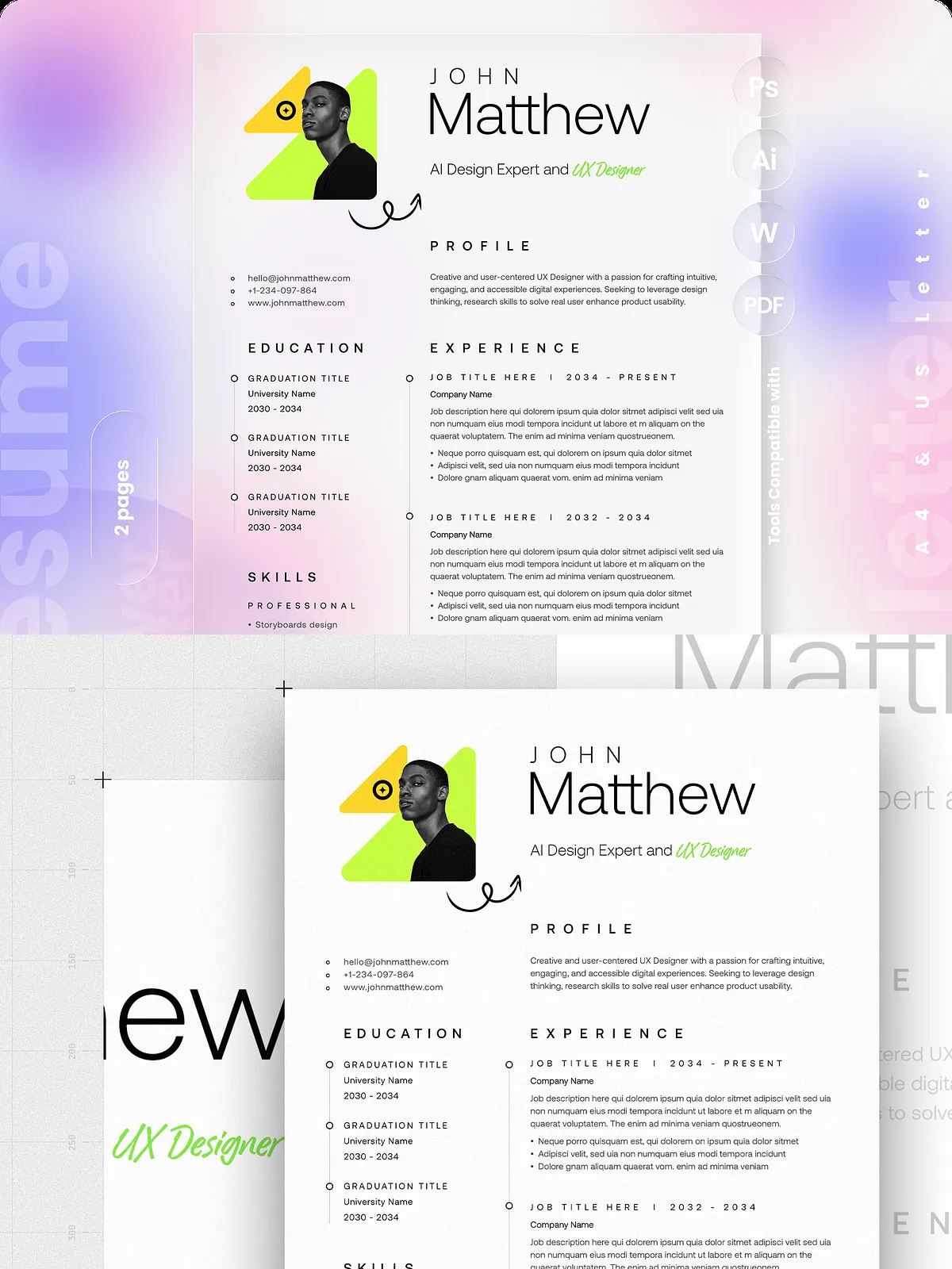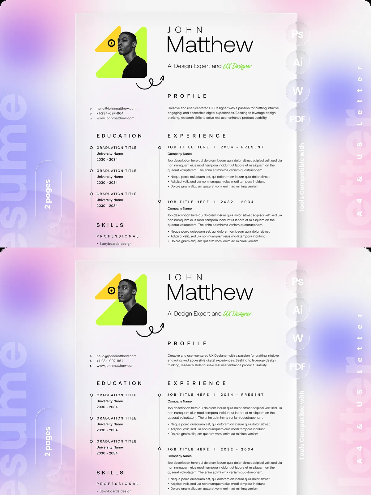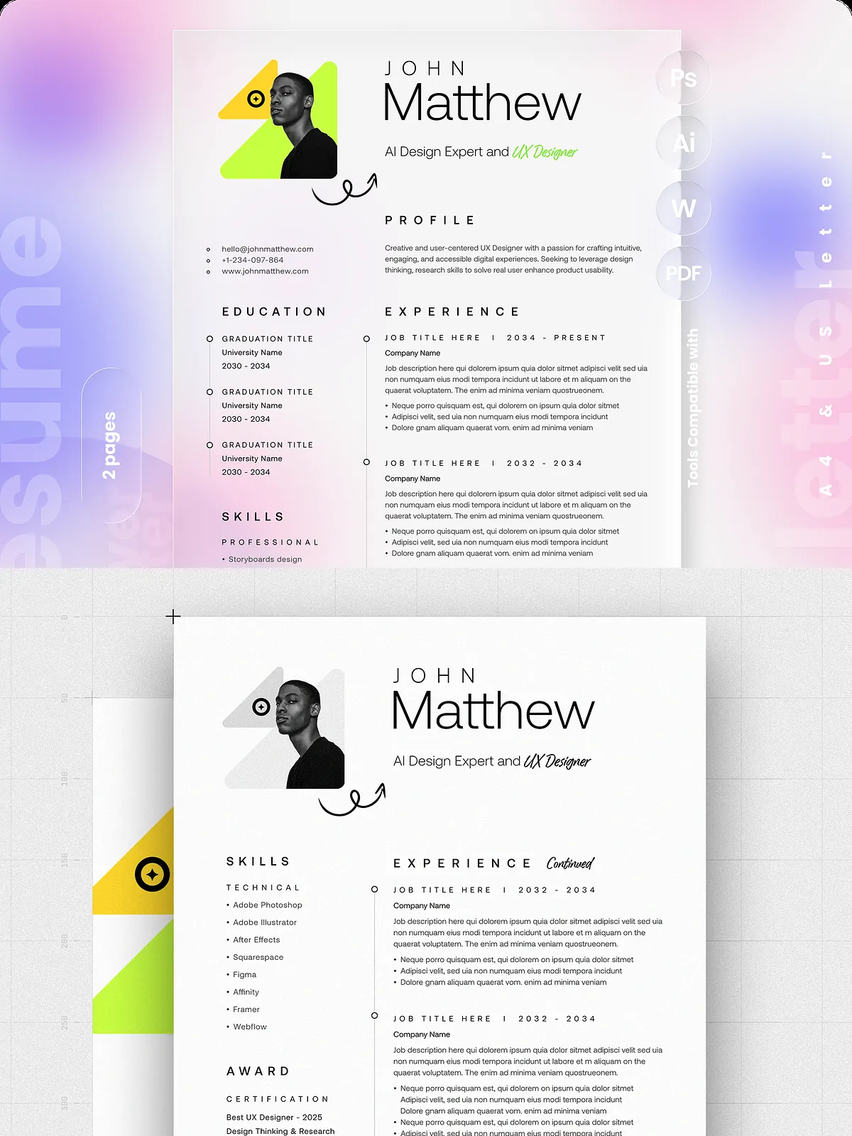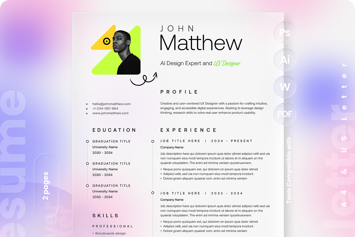 - Two-page resume layout optimized for A4 and US Letter sizes with bleed for professional printing.