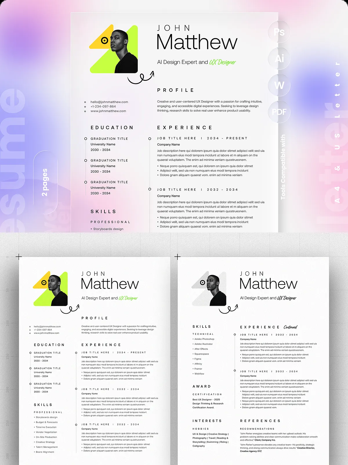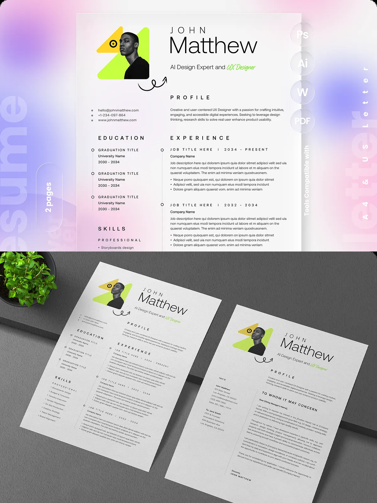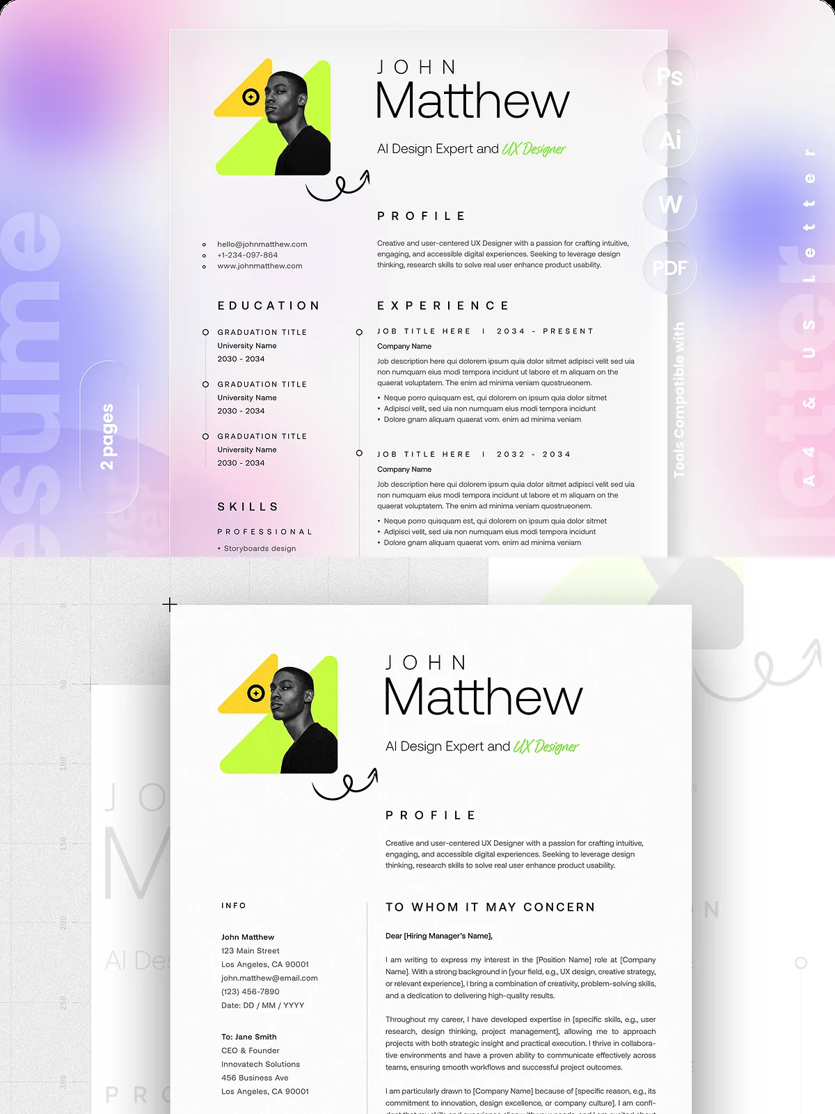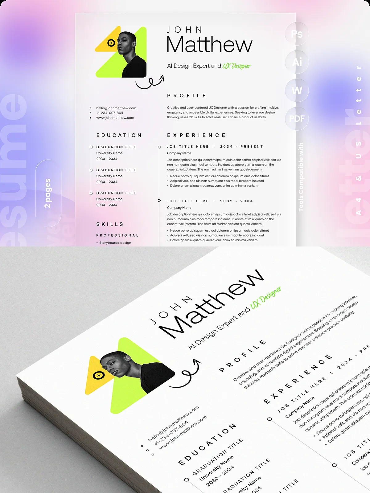- Two-page resume layout optimized for A4 and US Letter sizes with bleed for professional printing.