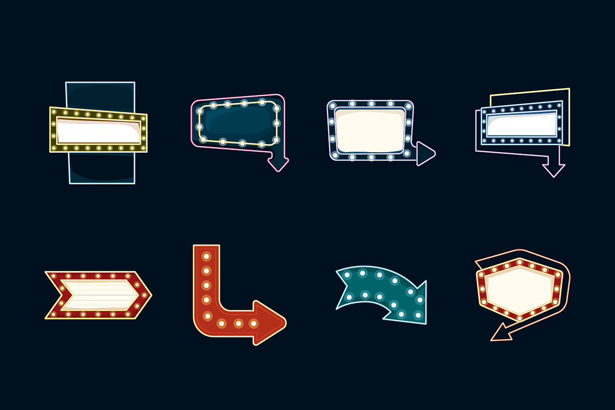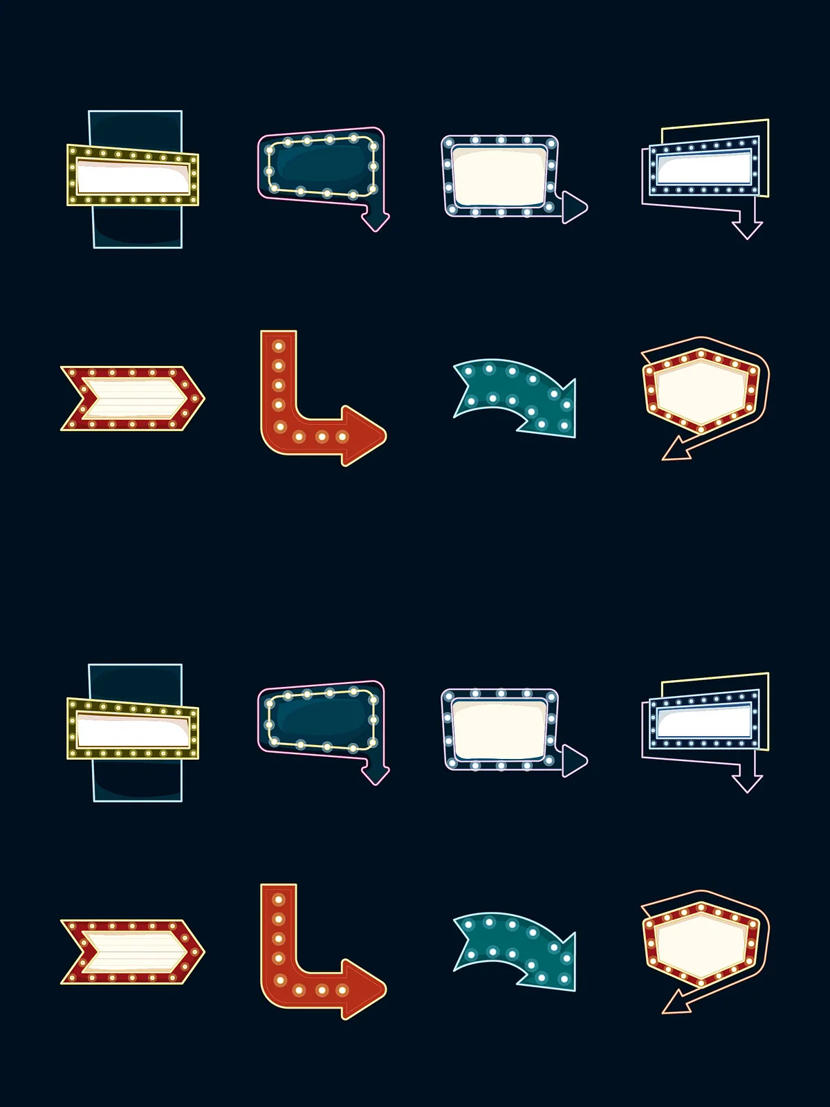 • Marquee Sign Icons: Full sign templates styled after classic American neon marquees, complete with blinking effects and frame details—perfect for music events, theater shows, or nightlife branding.