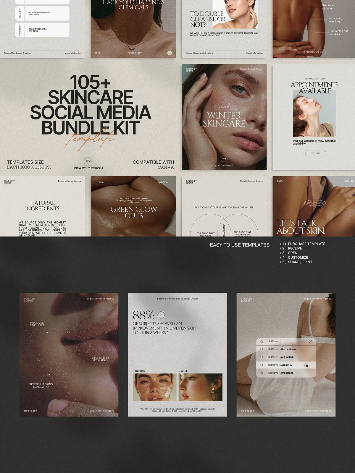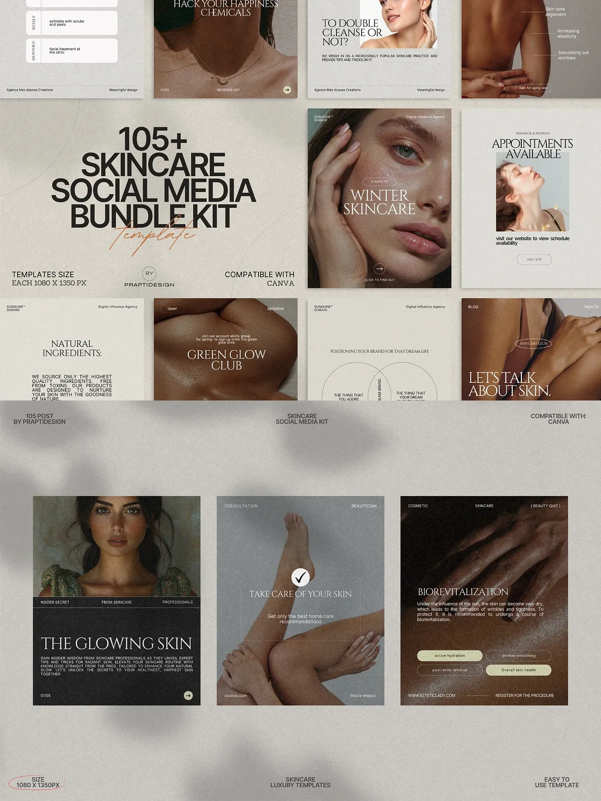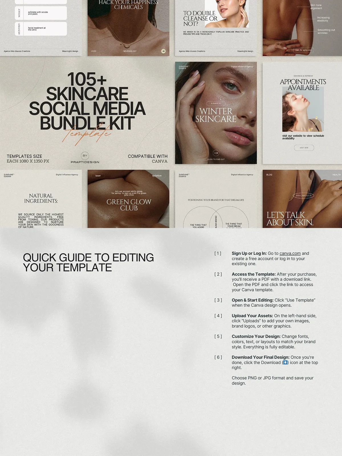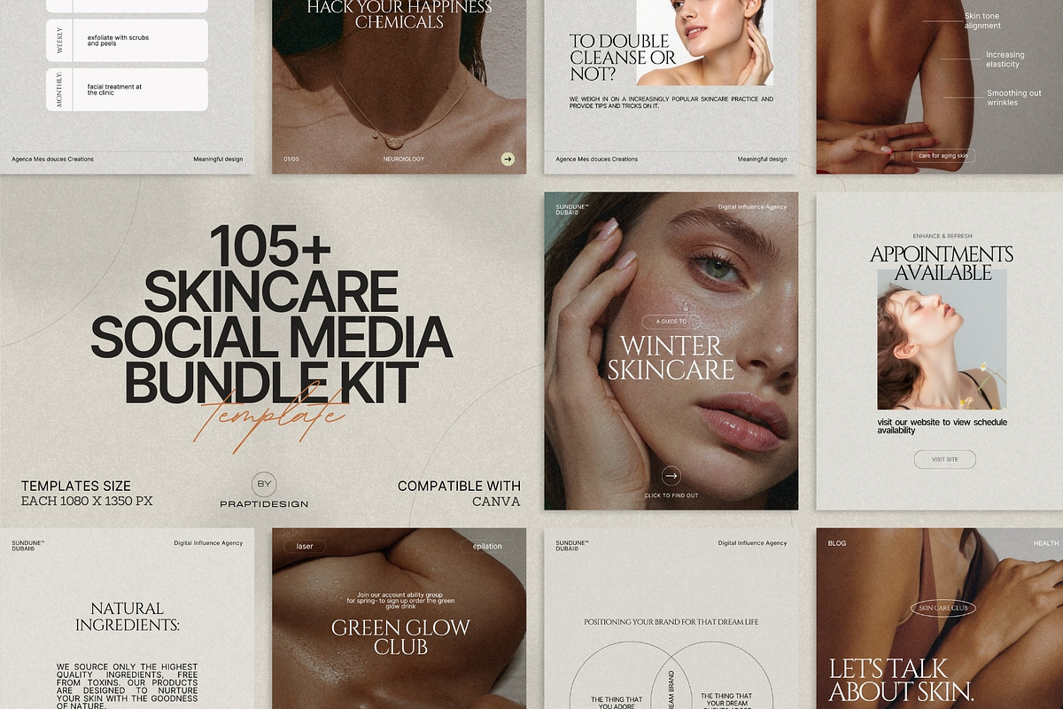 The power of this bundle lies in its simplicity and adaptability. All templates are fully editable in Canva—no design expertise needed. Change text, swap colors to match your brand palette, insert your own photos, or update typography in seconds. Whether you’re managing a personal brand, a small boutique skincare line, or a larger wellness agency, you can maintain consistency across every post with minimal effort.