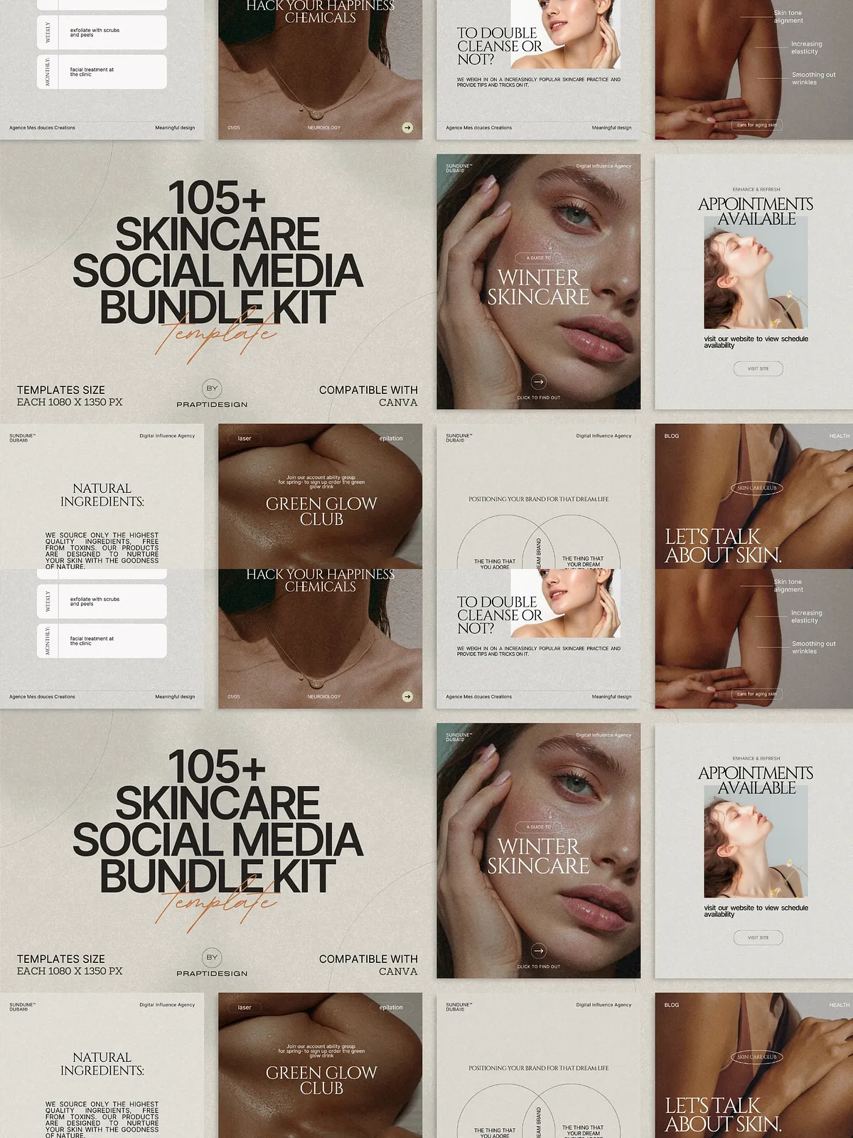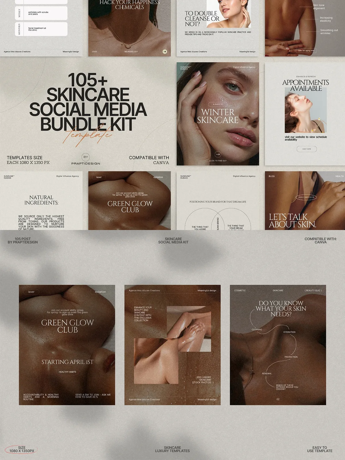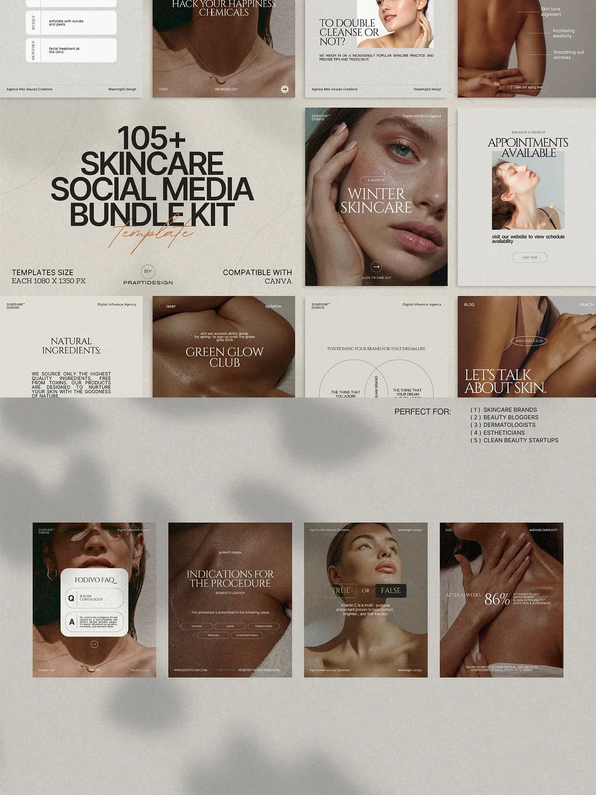 The power of this bundle lies in its simplicity and adaptability. All templates are fully editable in Canva—no design expertise needed. Change text, swap colors to match your brand palette, insert your own photos, or update typography in seconds. Whether you’re managing a personal brand, a small boutique skincare line, or a larger wellness agency, you can maintain consistency across every post with minimal effort.