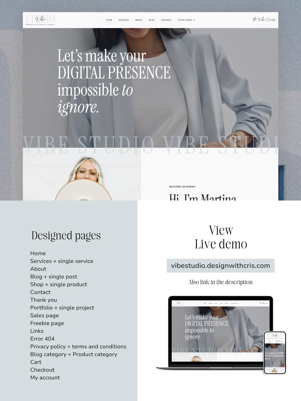 Vibe Studio isn’t just a template — it’s a foundation for building a website that reflects your values: clarity, intention, and beauty in simplicity. It’s the perfect choice for anyone ready to create an online space that feels calm, professional, and authentically you.