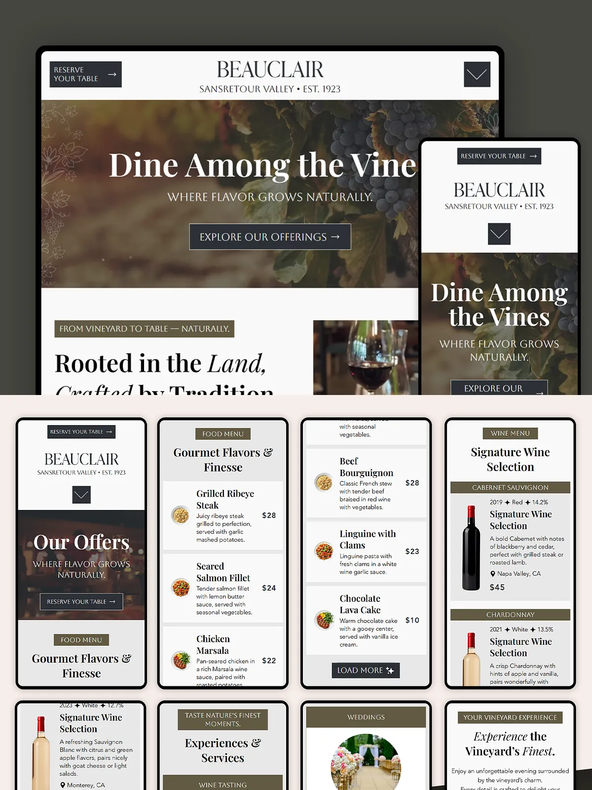 - Quick Links to Wine List, Menu, and Experiences – Guide visitors directly to key content with intuitive navigation that enhances user experience and reduces bounce rate.