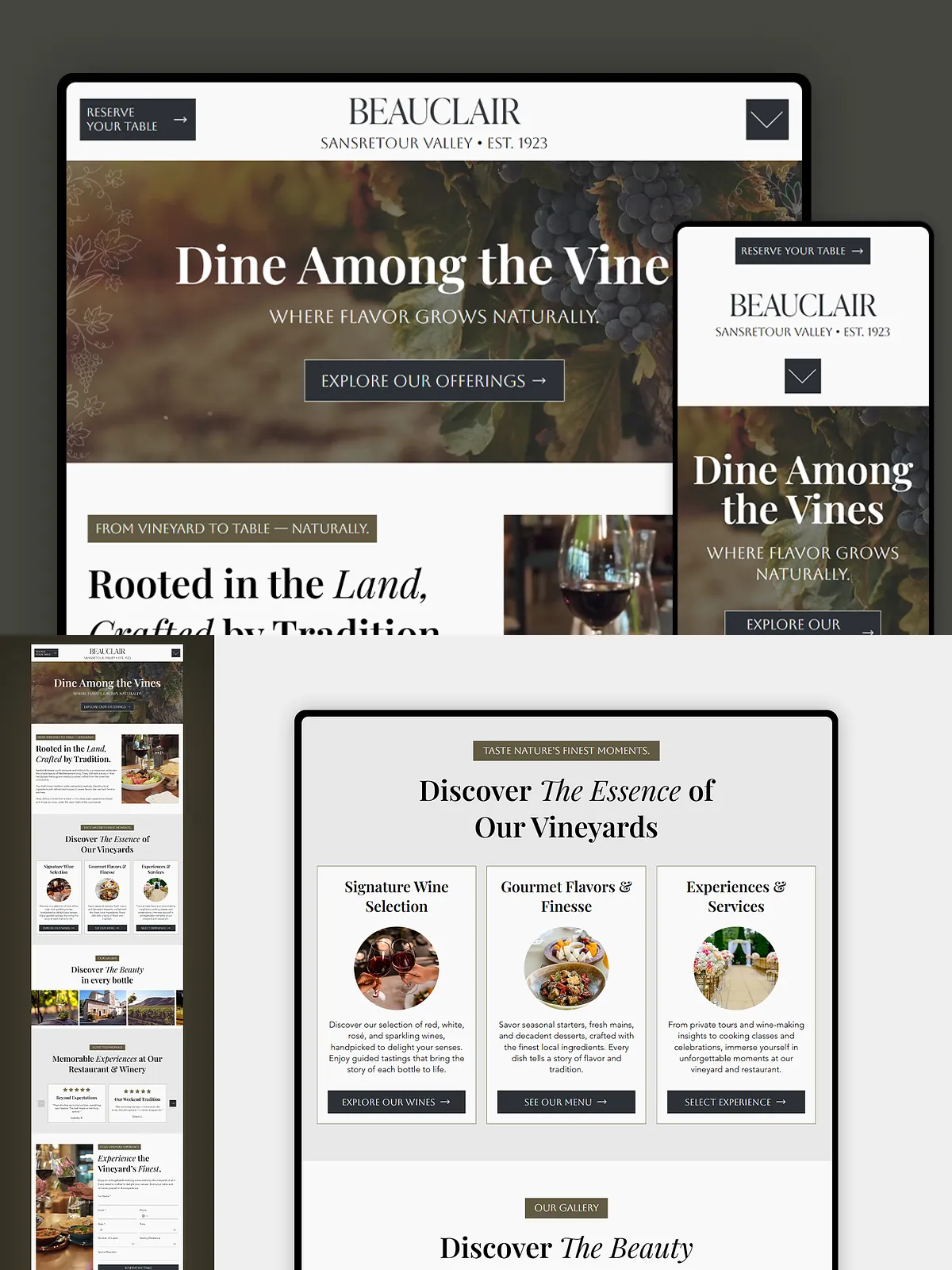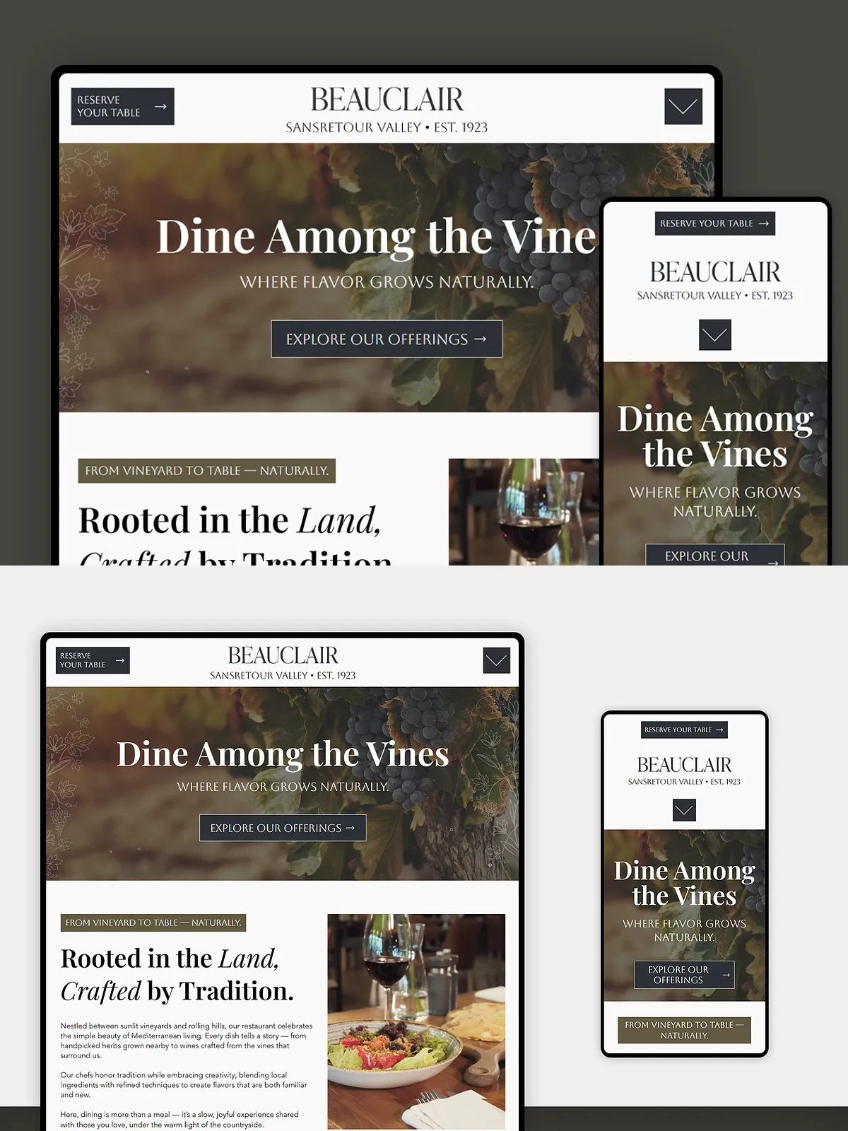 - Hero Banner with Animated Details and Call-to-Action – Capture attention instantly with a full-width visual of your vineyard, cellar, or signature dish — paired with bold, persuasive text that drives engagement.
