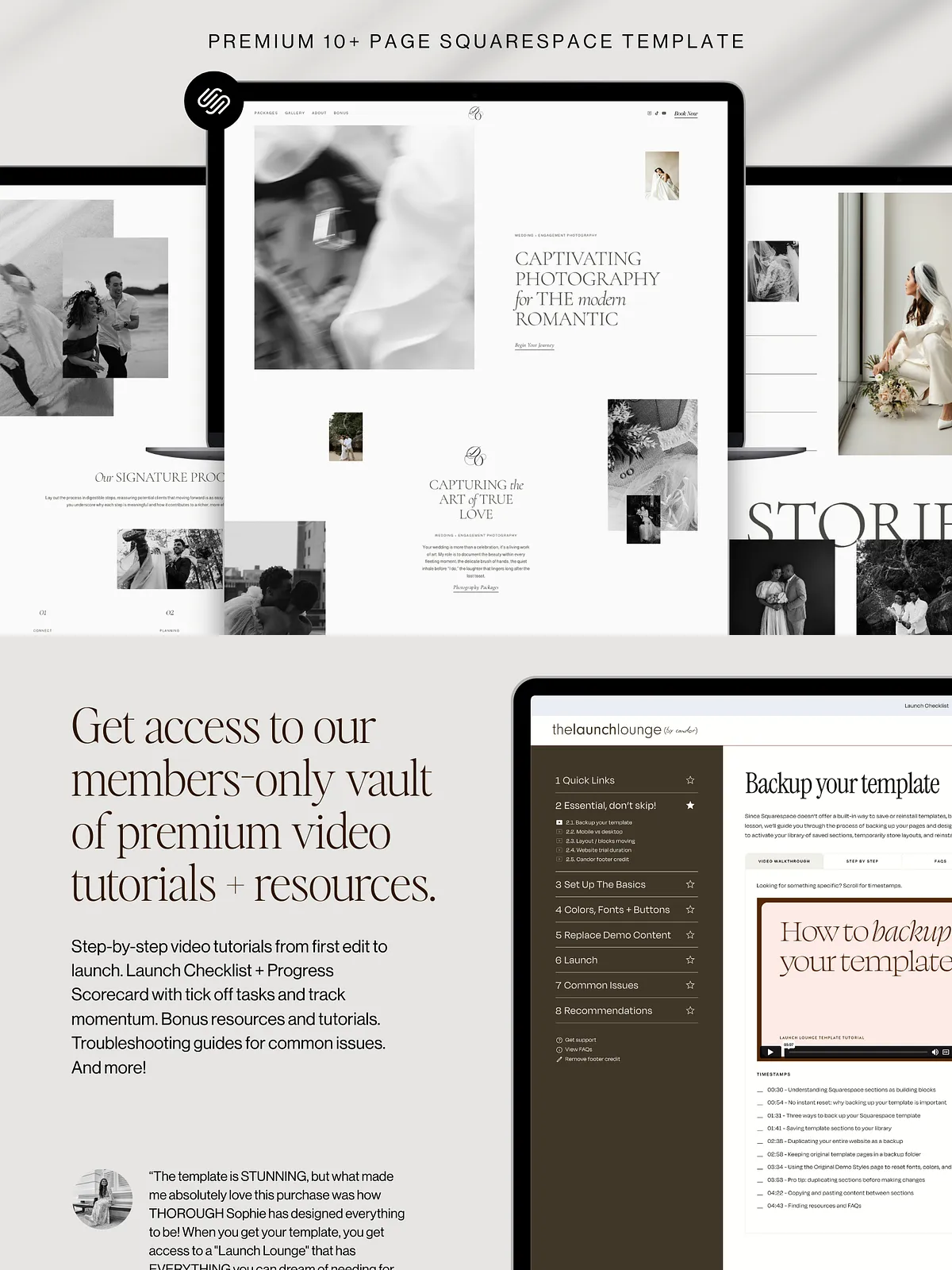 With your Dahlia purchase you receive access to the Launch Lounge — a resource hub with step-by-step guides, setup tutorials, and a Launch Checklist + Scorecard that walk you through customizing and publishing the site confidently.